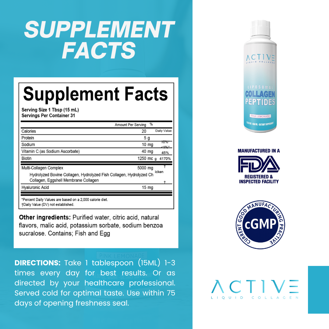 Elevate your beauty routine with ACTIVE Liquid Collagen, the ultimate blend of results and refreshment. Bursting with a refreshing Pink Lemonade flavor, this ready-to-drink formula delivers high-quality hydrolyzed collagen peptides + Biotin + Vitamin-C + Hyaluronic Acid—no mixing, no mess, just glow.