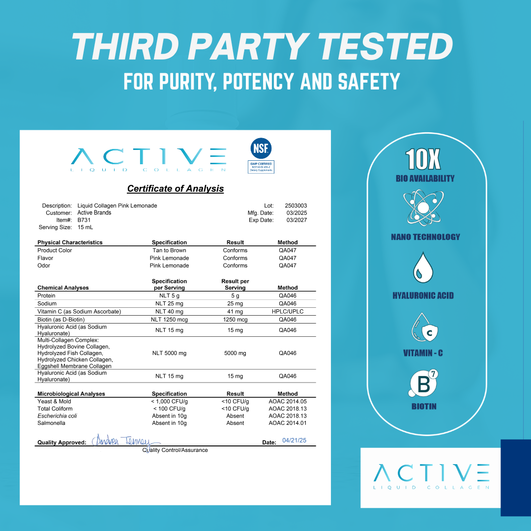 Elevate your beauty routine with ACTIVE Liquid Collagen, the ultimate blend of results and refreshment. Bursting with a refreshing Pink Lemonade flavor, this ready-to-drink formula delivers high-quality hydrolyzed collagen peptides + Biotin + Vitamin-C + Hyaluronic Acid—no mixing, no mess, just glow.